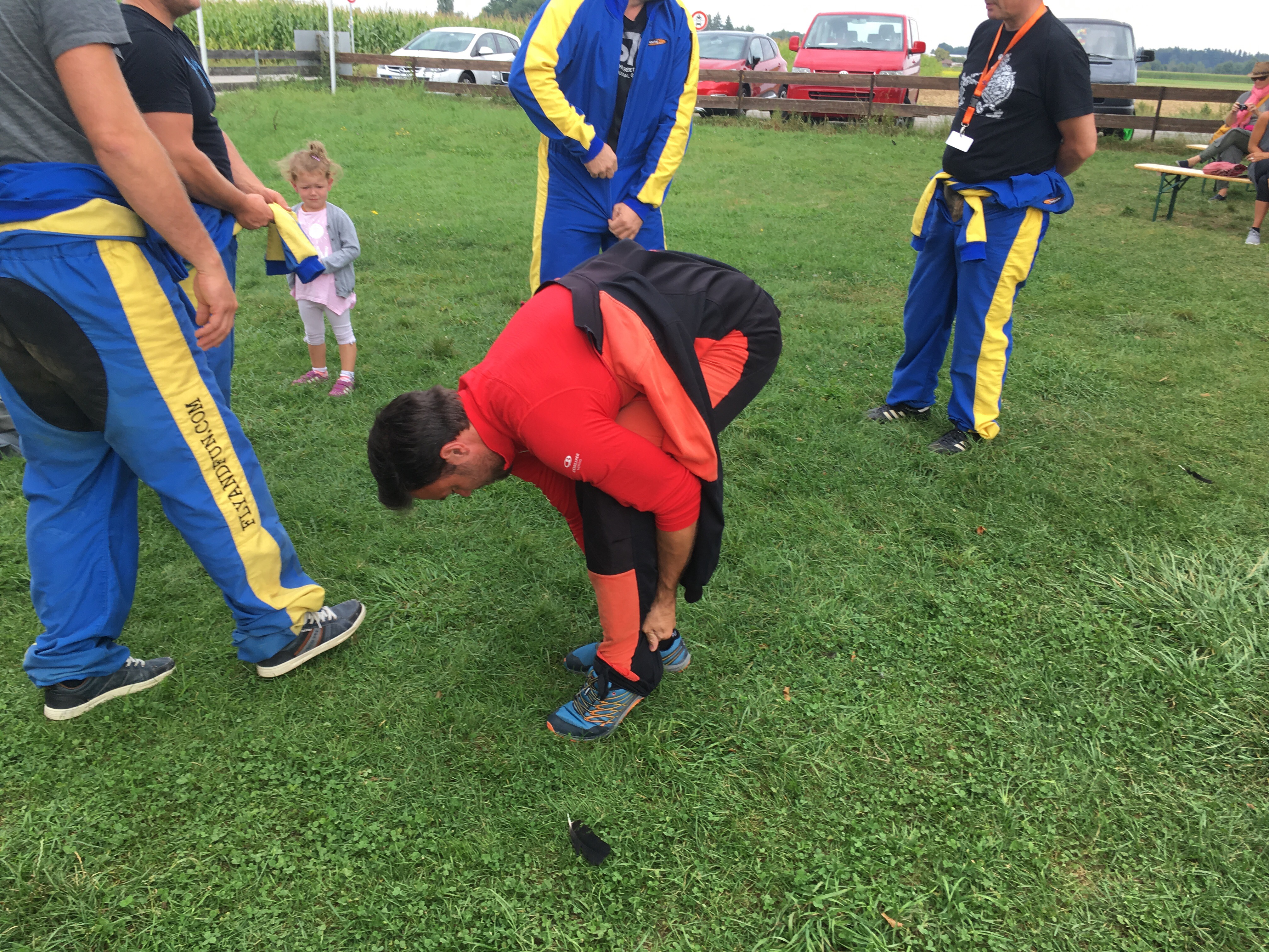 Berufssoldat – Weltmeister – der Mann ist bestimmt 2 Meter groß und ist kräftig wie ein ausgewachsener Bär. Der eben erwähnte Sprungleiter begrüßte uns und mir wurde das erste mal am Tag mulmig. Dieses Männlein, gerade mal meine Hälfte (und ich bin mit 182/86 nicht wirklich viel), soll mich sicher auf den Boden bringen? Puh.