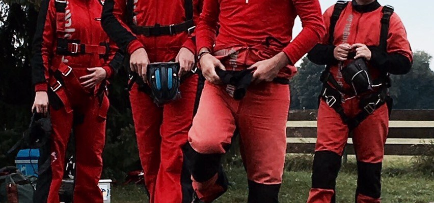 Zunächst geht’s zum umziehen- die richtige Größe des Anzugs finden, Brille und Helm… Helm? Als ob!
