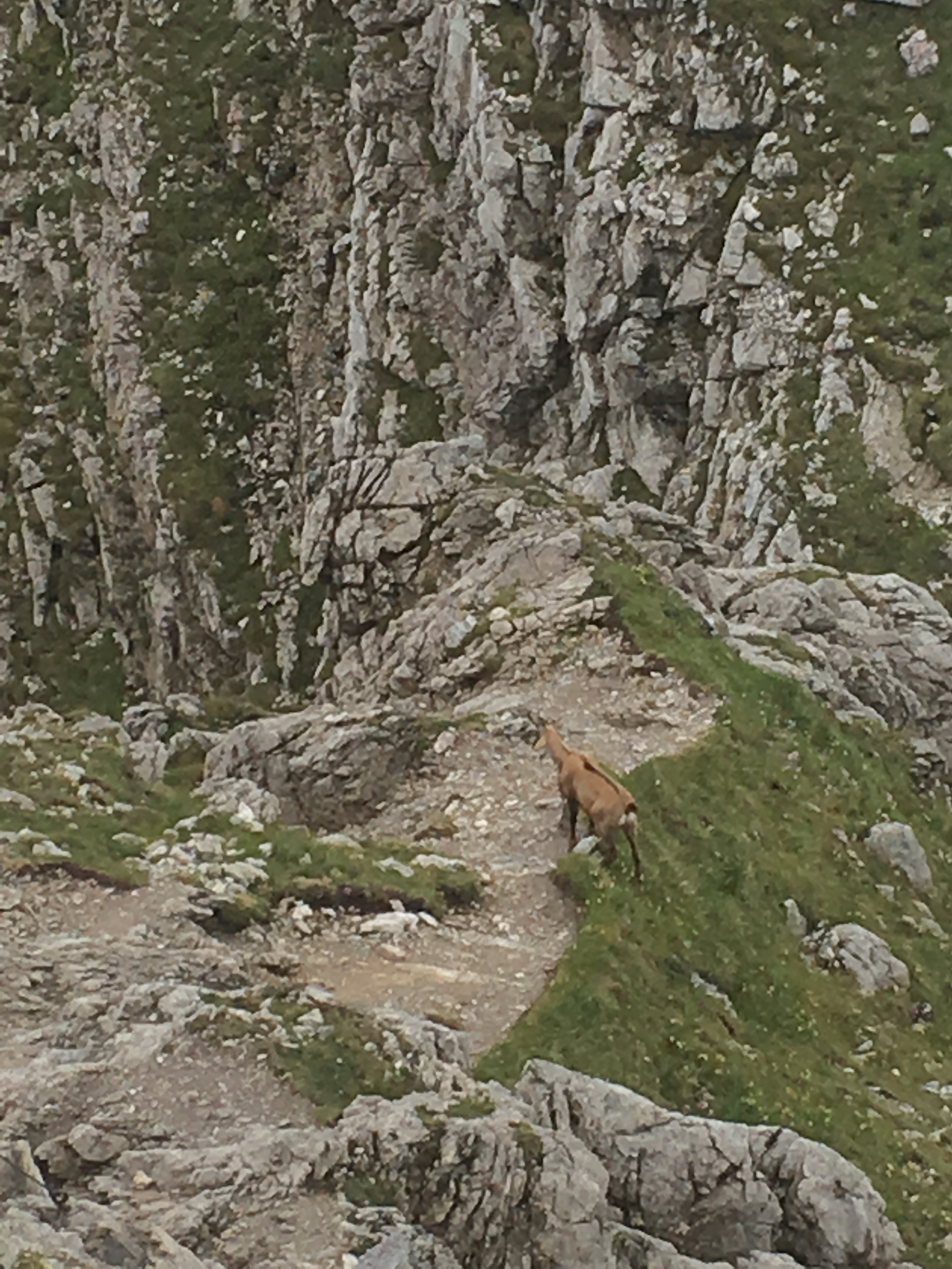 Gegen Mittag ging sogar der Himmel ein wenig auf und man hat mehr gesehen als die bloße Hand vor den Augen. Auf dem selben Grat wie wir wanderte eine Gams – sie begleitete uns eine ganze Weile. Auch während unserer Pause ließ sie sich von uns begutachten. Sie war schön anzusehen.