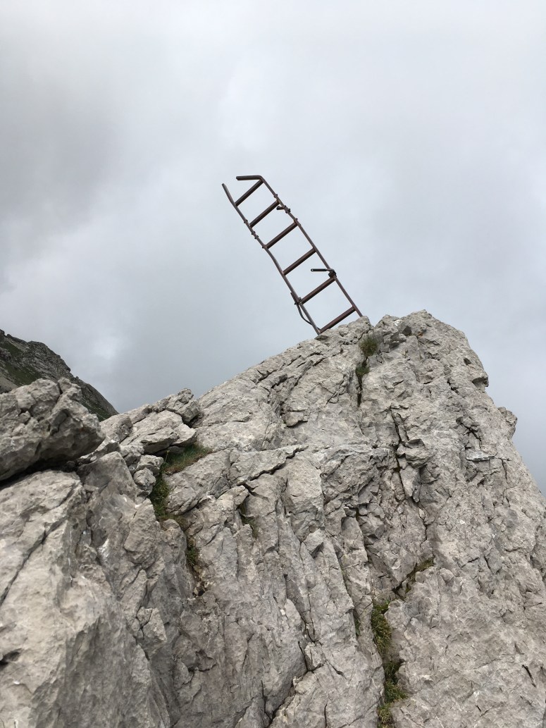 Am Gipfel des Nebelhorns angelangt weisen Schilder auf den Einstieg des Hindelanger Klettersteigs hin. Diese sind kaum zu übersehen. Gleich zu Beginn geht es mit einer langen Leiterpassage los. Ab jetzt kraxelt man von Spitze zu Spitze über abgesicherte und auch über nicht gesicherte Passagen. Immer wieder darf man steilere Stücke des Weges mit Leitern überwinden.