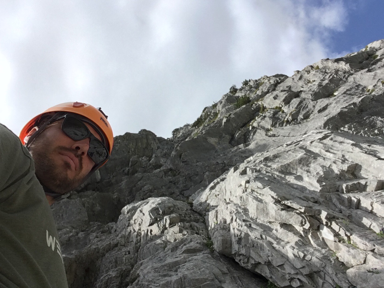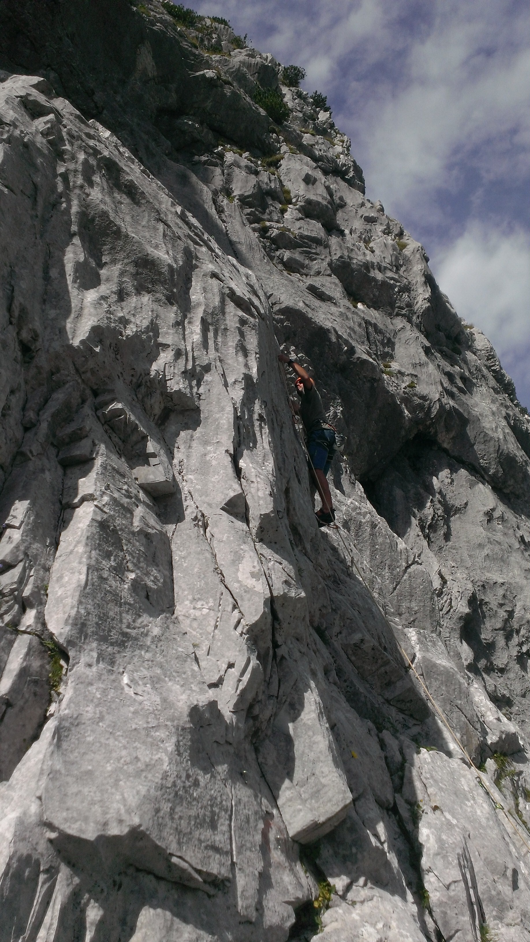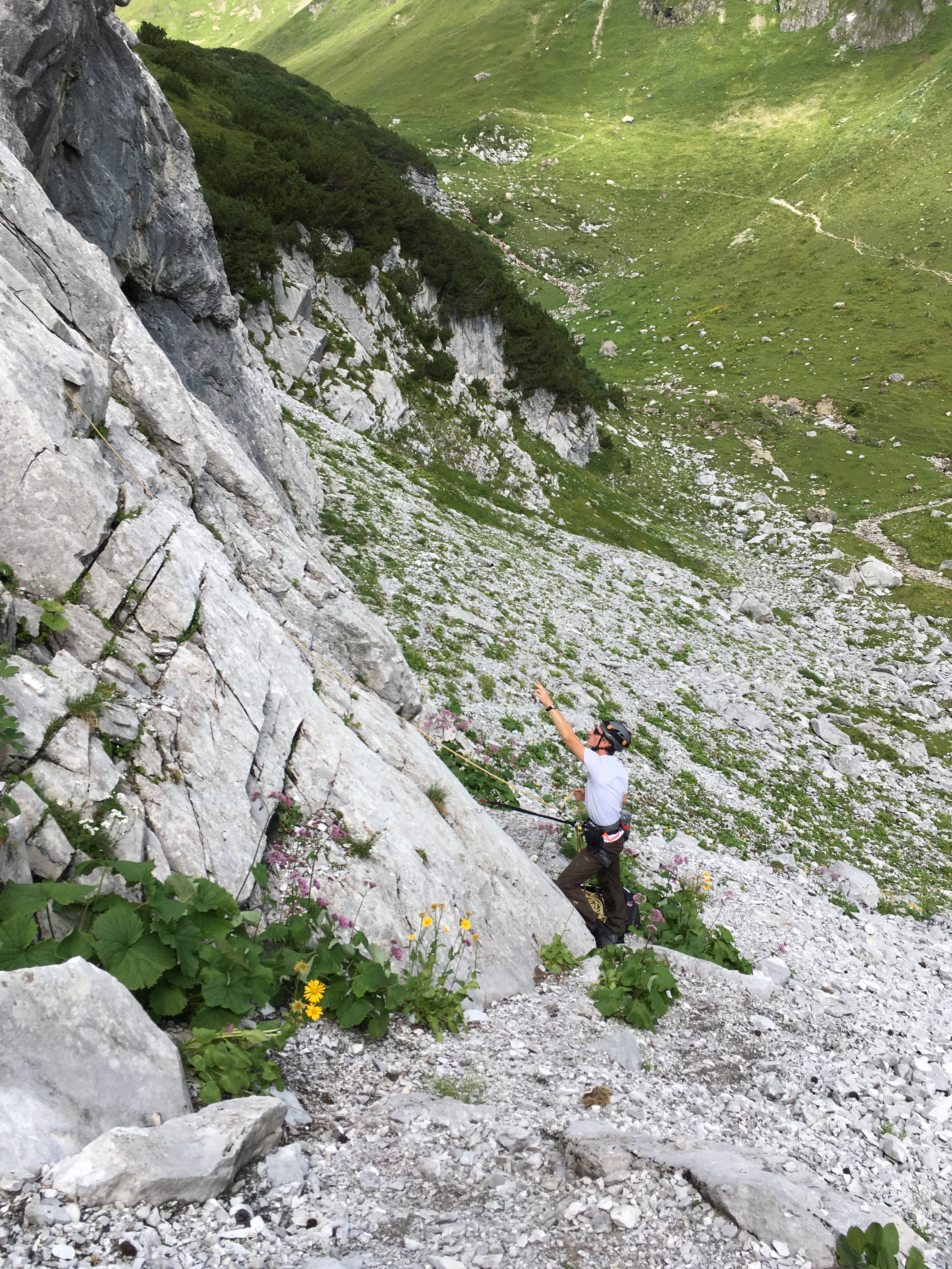 Als nächste schwierige Herausforderung kommt die Routensuche auf uns zu. Die Schwierigkeiten und Namen sind zwar angegeben, jedoch nicht analog zur Topo die wir aus dem Internet haben. Demnach empfehle ich euch erst mal keine Topo. Es sei denn ihr habt den Alpinkletterführer Vorarlberg dieser beschreibt die Routen optimal. Eines sagen jedoch alle, egal ob Internet oder Kletterführer: