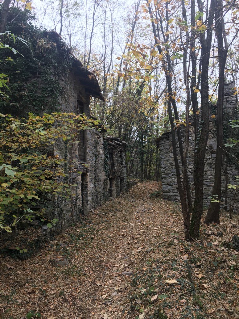 Wenn der Höhenweg auf das nächste Dorf, Cargiago, trifft führt dieser nun steil und stetig bergauf. Weg vom Dorf und wieder richtig rein in den Wald. Nachdem wir wieder den Bach überquert haben führt der Wanderweg durch Porteia. Einer alten verlassenen Ansammlung von Steinhäuser.