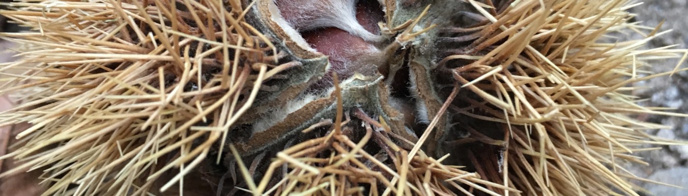 Doch gibt es im Herbst eher Orientierungsprobleme. Das Laub der Bäume stellt uns vor die Herausforderung den Weg ohne ersichtlichen Weg zu finden. Doch aus dem Laub sticht es immer wieder in den Schuh hinein. Das Laub, welches den Weg verdeckt kommt von dem Kastanienbäumen. Maroni – die Esskastanie.