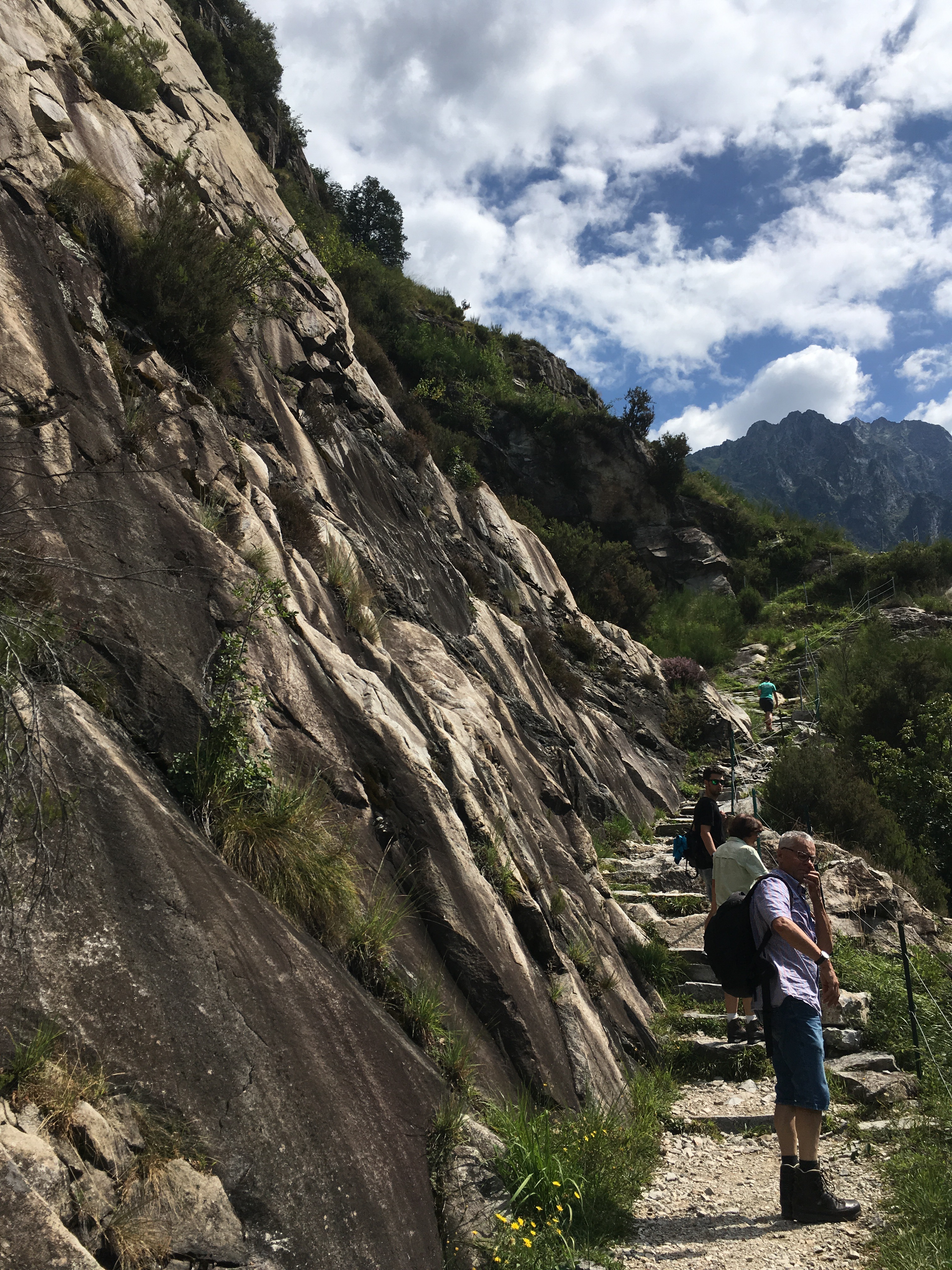 Zunächst geht es stufenartig die gesamten 600 Höhenmeter über dem Mezzolasee steil nach oben. Treppen welche in den Fels geschlagen wurden machen den Weg in einigen Abschnitten gut begehbar. Manchmal findet man den Weg aber nur weil das Sicherungsgeländer noch steht.