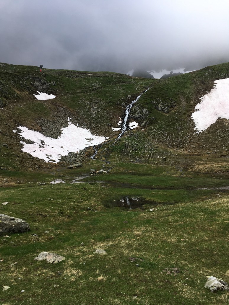 Von der Bergstation geht es in Richtung Norden, bergauf zum Skitunnel. Durch diesen Skitunnel sind wir durchgelaufen. An dessen Ende hat man normalerweise einen tollen Blick auf das Hochjoch und den darunter liegenden Schwarzsee, der seinem Namen definitv gerecht wird. Leider war es am Tag unseres Aufsteigs neblig und man hat am Vormittag die eigene Hand vor Augen kaum erkannt.