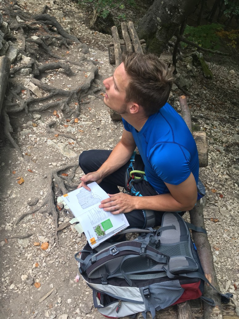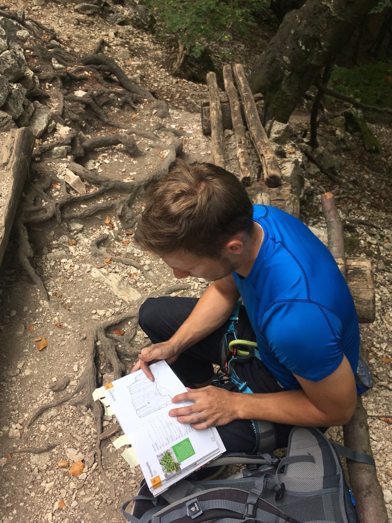 Am Felsen angekommen wird erst einmal die Topo gecheckt und die Routen ausgesucht. Der Kletterführer des Donautals beschreibt Fels und Routen optimal.