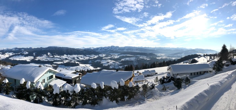 Nach dem Langlaufen ist ein Abschlussgetränk pflicht. Doch sollte man sich bicht mit dem Naheliegenden begnügen sondern man sollte das Gasthaus Alpenblick besuchen. Auf deren Sonnenterrasse hat man einen wunderschönen Ausblick auf den Bregenzer Wald und natürlich auch die Alpen.