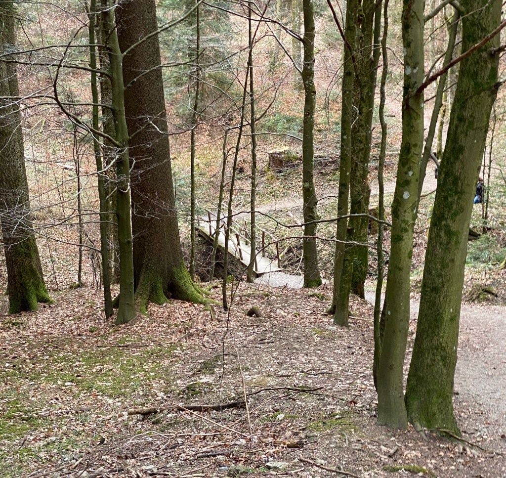 Erst wenn man wieder in den Wald kommt und dort auf den Waldweg einschlägt, kann man wieder die Natur genießen. Auch hier kann man einige Höhenmeter ergattern denn es geht zunächst einmal hinunter ins Tal über eine schön anzusehende Holzbrücke und anschließend wieder steil nach oben.